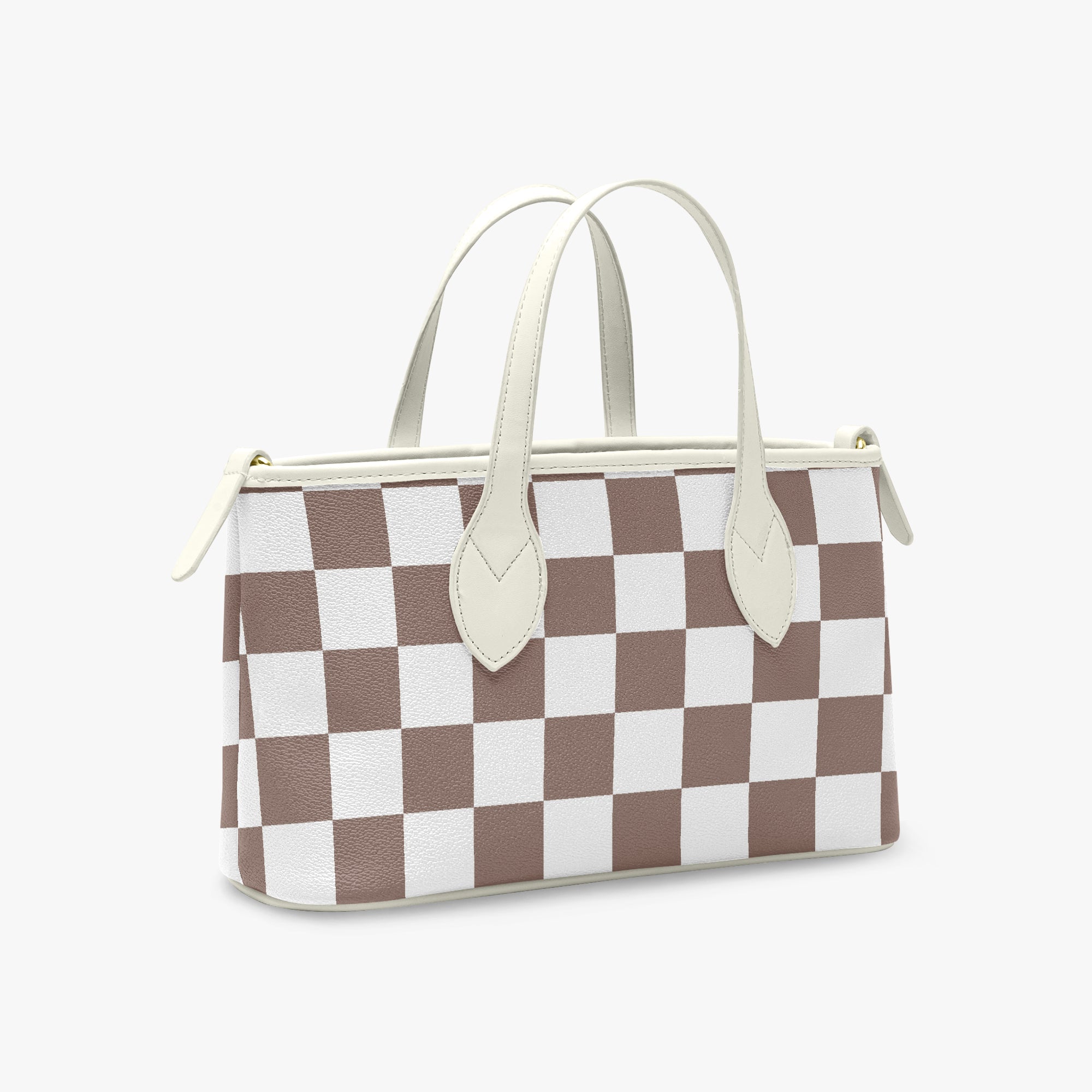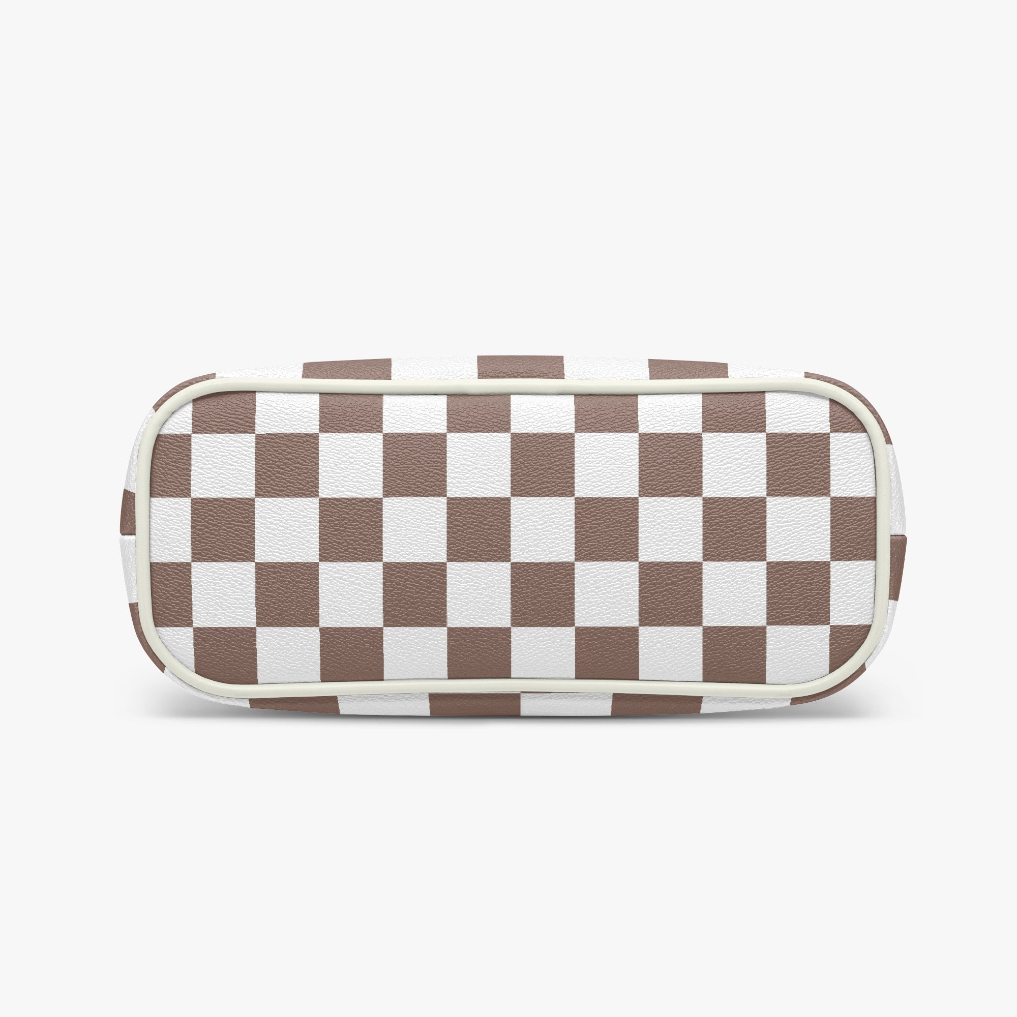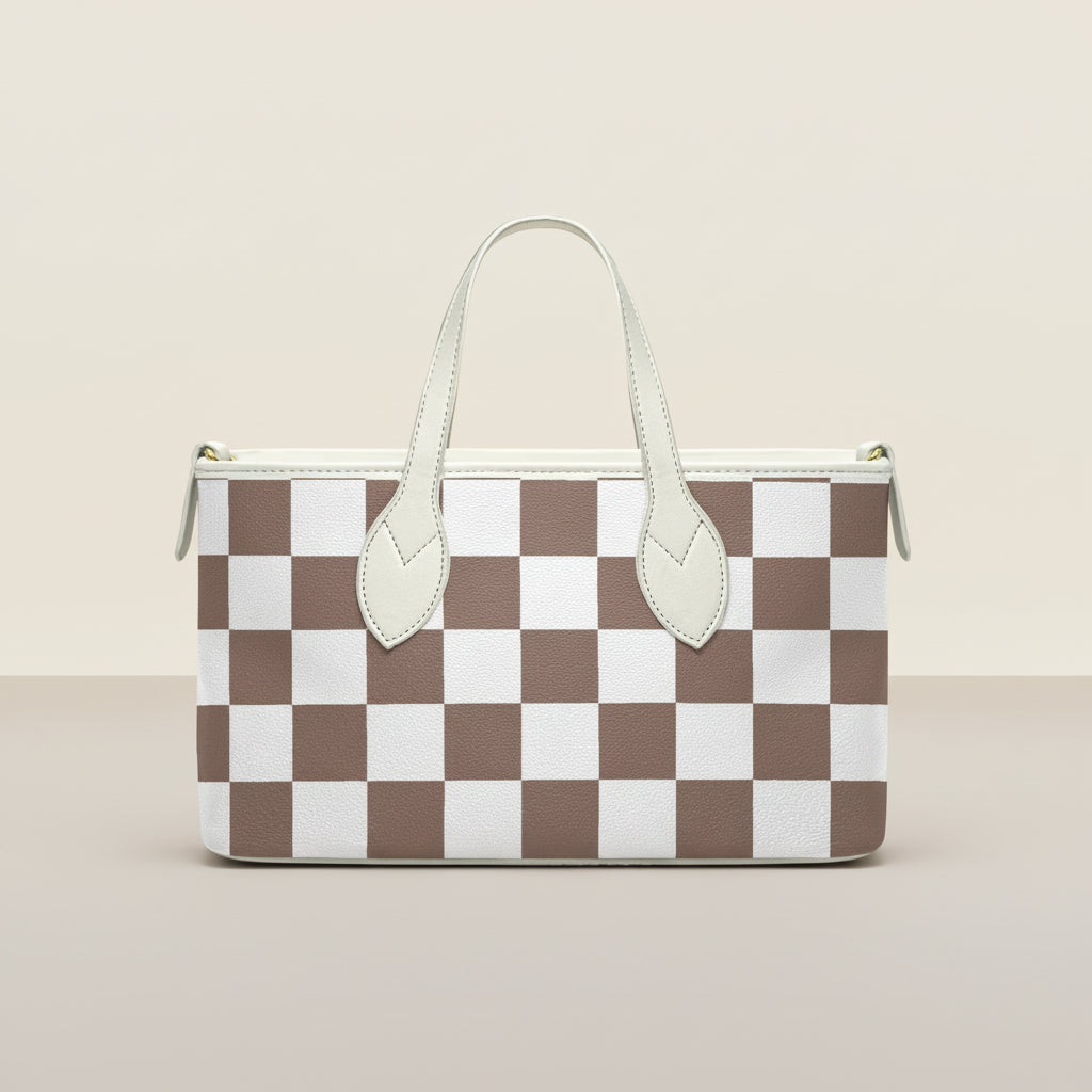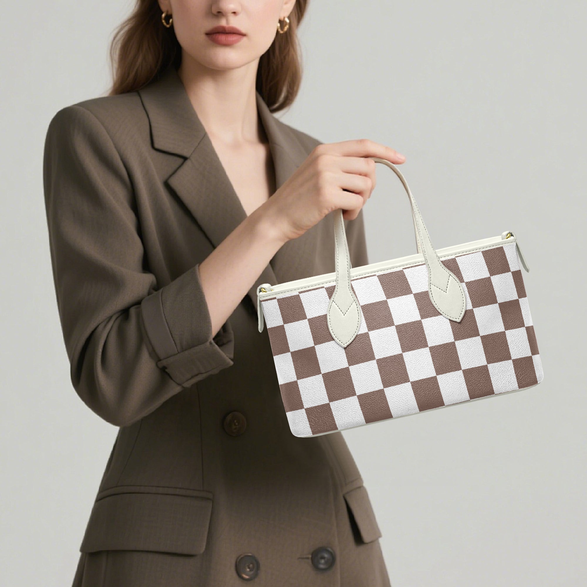 Bring a touch of classic elegance to your daily rotation with our small checkered tote bag in a warm brown and white colorway. Crafted from high-quality PU leather, this brown checkered tote bag offers a premium look and long-lasting strength, making it a reliable wardrobe staple. Its compact handheld design and timeless neutral pattern make it the perfect choice for those who value both functionality and boutique fashion.