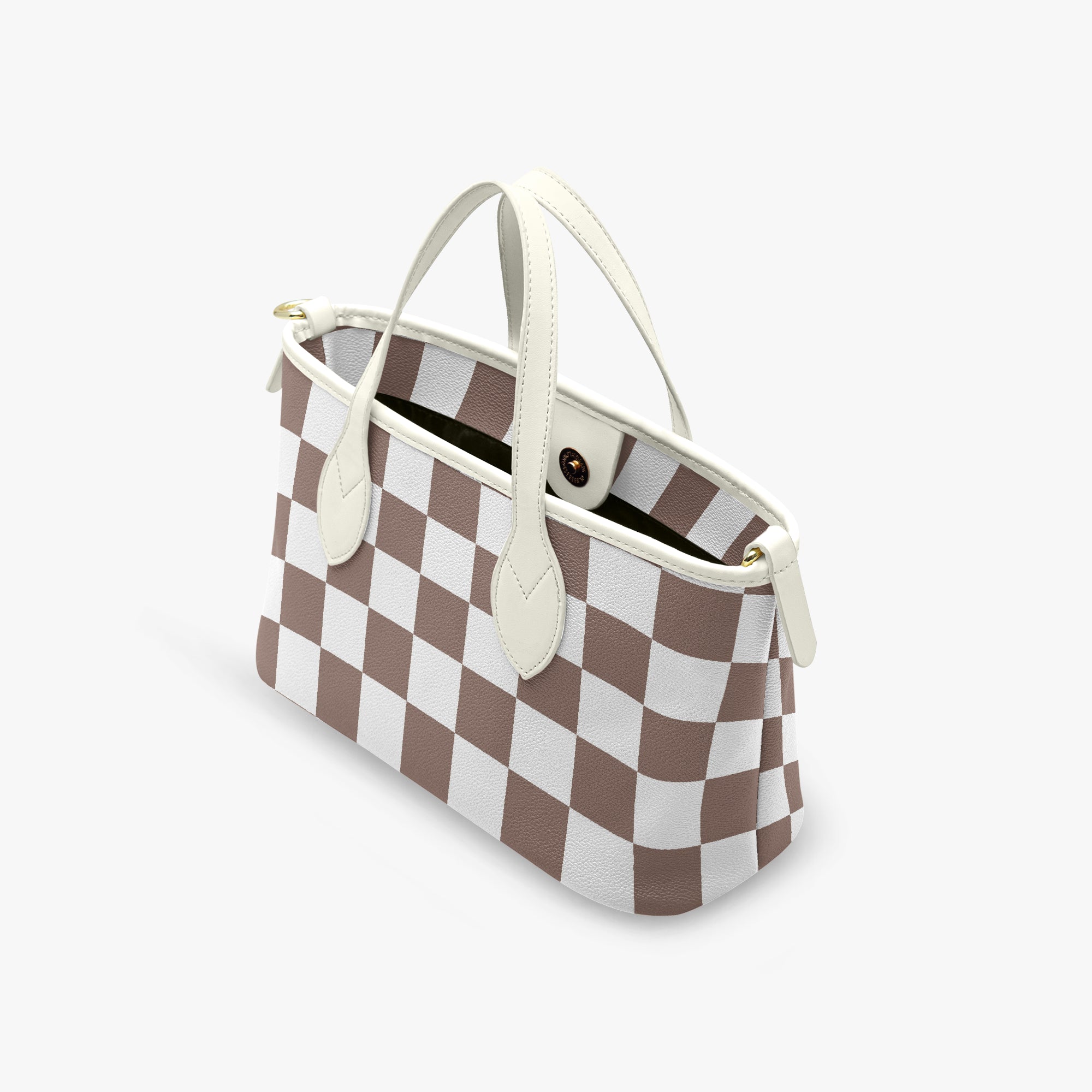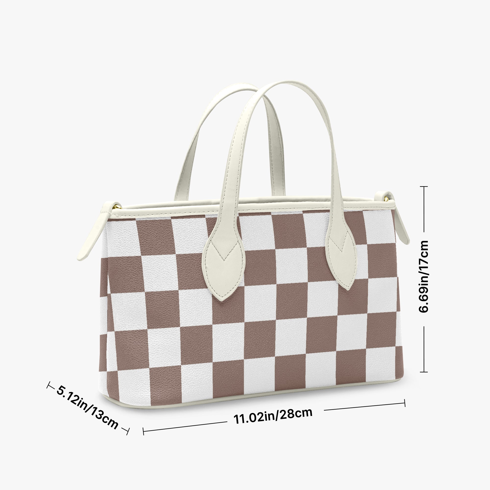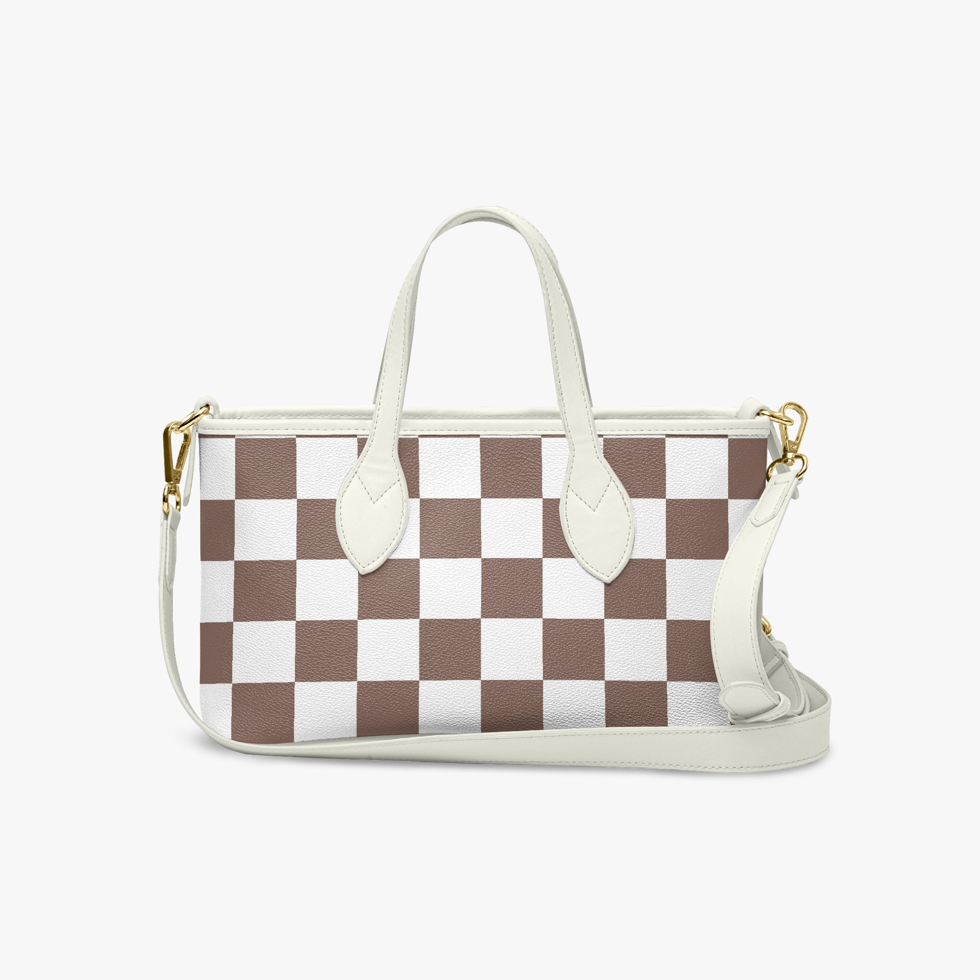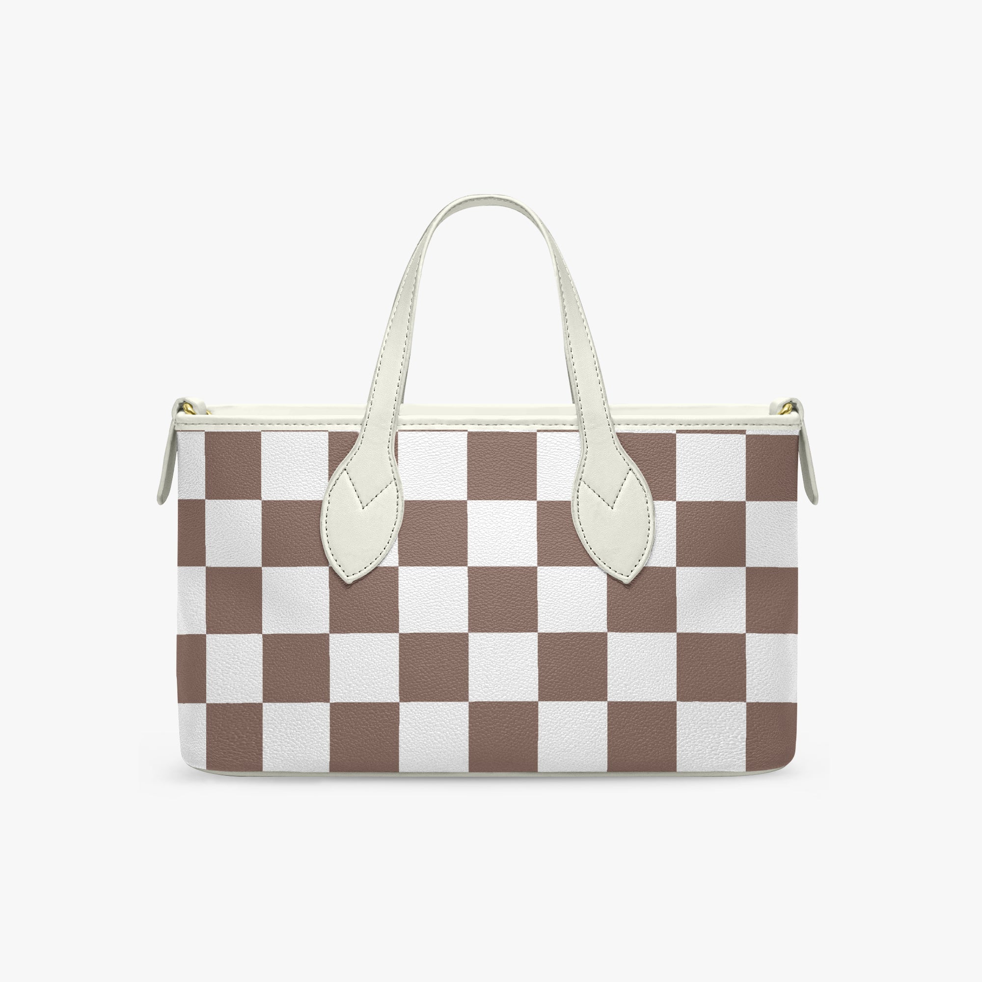 Bring a touch of classic elegance to your daily rotation with our small checkered tote bag in a warm brown and white colorway. Crafted from high-quality PU leather, this brown checkered tote bag offers a premium look and long-lasting strength, making it a reliable wardrobe staple. Its compact handheld design and timeless neutral pattern make it the perfect choice for those who value both functionality and boutique fashion.